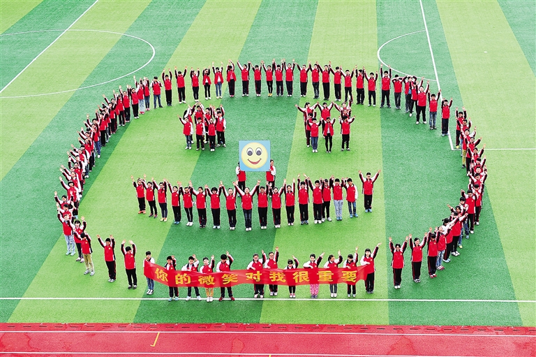 5月6日,合肥市龙岗中学的学生们在操场上拼出“笑脸”图案。当日,安徽省合肥市龙岗中学开展“你的微笑对我很重要”主题活动。活动中,学生们在操场上组合拼出“笑脸”的图案,倡导用微笑去感染别人,让校园充满微笑,迎接5月8日世界微笑日的到来。 新华社记者 杜宇 摄