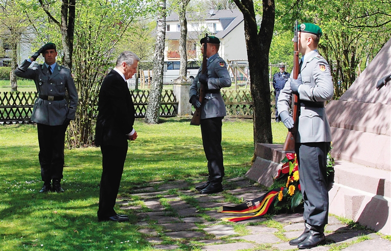 5月6日,德国总统高克(左二)在德国小镇施洛斯霍尔特-施图肯布罗克的苏军战俘营纪念公墓前敬献花圈。当日,德国总统高克在施洛斯霍尔特-施图肯布罗克的苏军战俘营纪念公墓出席第二次世界大战结束70周年纪念活动。 新华社记者 罗欢欢 摄
