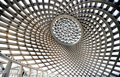 这是正在建设中的于家堡站穹顶(5月5日摄)。 近日,京津城际铁路延伸线工程进入收尾阶段,预计将于8月份正式通车运行,从北京南站乘坐城际列车可直达天津自由贸易试验区的于家堡站。京津城际铁路延伸线是京津城际铁路的延伸和继续,工程西起天津站,途经军粮城北站、塘沽站,东至于家堡站,全长45.1公里,设计时速为350公里。通车后,北京南站、天津站到达于家堡的时间将分别被缩短至45分钟、15分钟。 新华社记者 岳月伟 摄