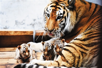 5月6日,几只东北虎“萌娃”依偎在母虎身旁。 从4月开始,东北虎人工饲养繁育基地——黑龙江东北虎林园逐步进入东北虎繁育高峰,目前已诞下今年首批20余只东北虎“萌娃”。新生的小东北虎状态良好,最大的已经满月。 黑龙江东北虎林园于1986年建立,从建立之初的8只种虎繁育至今,园内的活体东北虎已达千余只。 新华社记者 王建威 摄
