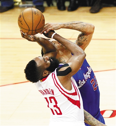 图为火箭队员哈登(左)与对手拼抢。