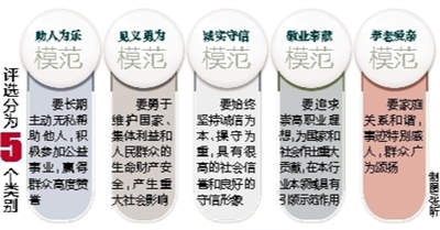 本届评选活动将分为“助人为乐”、“见义勇为”、“诚实守信”、“敬业奉献”、“孝老爱亲”等5个类别,对50名道德模范进行表彰。