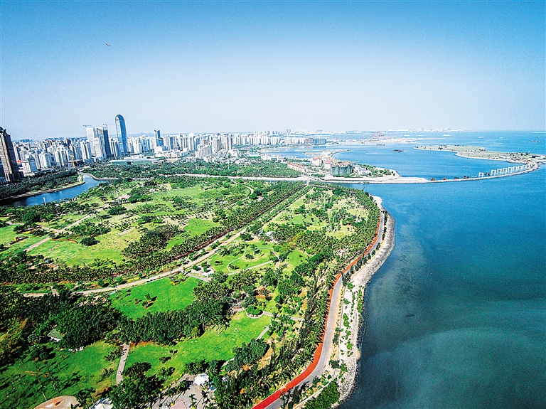 航拍海口市万绿园、海口湾。海口常年林木茂盛,处处绿荫掩映。借助得天独厚的资源优势,海口坚持生态立市、环保优先,致力于打造“四宜三养”省会城市。目前,海口已成为全国名列前茅的宜居城市。本报记者 李幸璜 摄