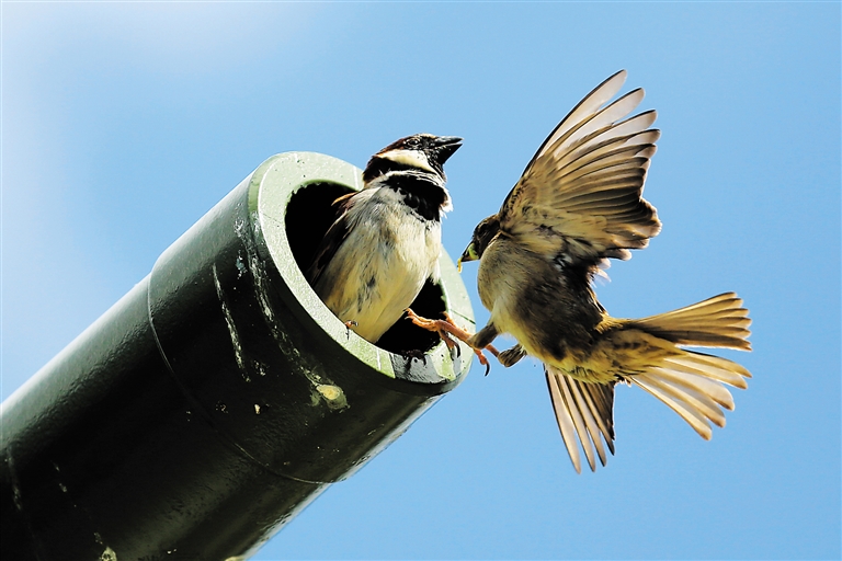 这是近日在德国柏林蒂尔加滕区一辆原苏联坦克的炮口处拍摄的两只麻雀。这辆停放在德国柏林蒂尔加滕区的原苏联坦克是用来纪念第二次世界大战中阵亡的苏联士兵,如今一群麻雀已在炮口筑巢。 新华社/美联