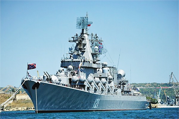 旗舰: “莫斯科”号▶ “莫斯科”号巡洋舰是俄罗斯海军黑海舰队旗舰,属光荣级大型燃气轮机巡洋舰,满载排水量11500吨,反舰、防空、反潜攻防兼备,主要用于打击航空母舰,并担任编队的防空和反潜任务。舰上最引人注目的是16具巨大的圆筒形SS-N-12“沙箱”远程舰舰导弹发射装置。