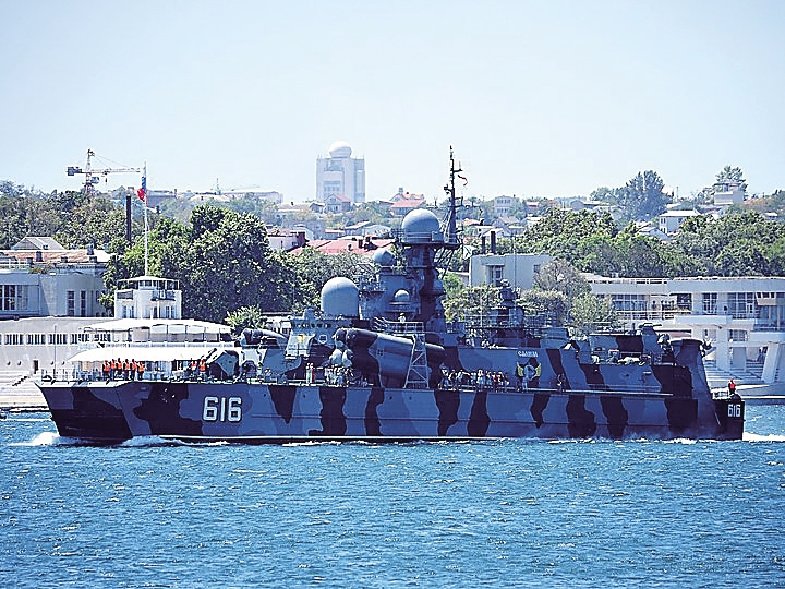 导弹气垫艇: ◀“西蒙风”号 “西蒙风”号导弹气垫艇是首次参加“海上联合”军事演习,主要担负水面突击任务,装备两座四联装SS-N-22超音速反舰导弹,火力相当于俄现代级导弹驱逐舰。标准排水量850吨,是一种侧硬式气垫船,也是世界上最大的表面效应作战舰艇,最高航速高达40至55节,2000年年初进入俄罗斯黑海舰队服役。