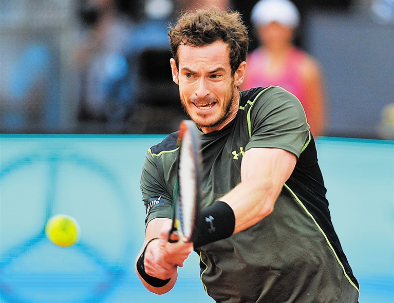 5月10日,在马德里网球公开赛男子单打决赛中,英国选手穆雷以2:0击败西班牙选手纳达尔,夺得冠军。图为穆雷在比赛中回球。 新华社发