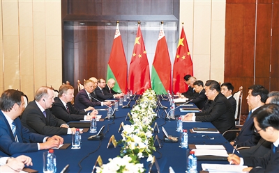 习近平指出,昨天,我同卢卡申科总统举行了坦诚深入、富有成果的会谈,我们一致决定两国以携手共建丝绸之路经济带和世界反法西斯战争胜利70周年为契机,巩固传统友谊,加大相互政治支持,开展全方位务实合作,密切在国际和地区事务中的协调配合。希望双方落实好这些重要共识,特别是对接好双方发展战略,加快推动中白工业园等大项目合作,更好推进两国发展,造福两国人民。