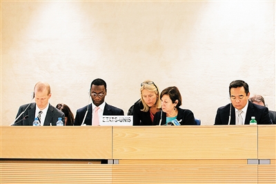 5月11日,在瑞士日内瓦,美国代表团成员出席联合国人权理事会会议并聆听各国代表发言。 联合国人权理事会普遍定期审议工作组当日对美国人权状况进行了国别审查,122个联合国成员国在会议上发言,对美国在人权领域存在的诸多问题提出了批评和建议。 新华社记者 徐金泉 摄
