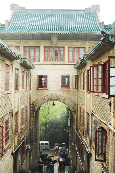 雨中漫步武大,人不多,反倒能静静欣赏这座以美著称的校园。因为地形地势的缘故,我们称武大是“山上的大学”,陡坡很多。犹记得那条著名的樱花道,沿着一排樱花树往上走,仿佛有一种登高临眺之感。即便樱花落尽,置身其中,仍能幻想出一幅樱花满目的画面。樱花蒸饺、樱花标本、樱花扇……樱花,仿佛成了武大的另一个标签,浪漫而美好。
