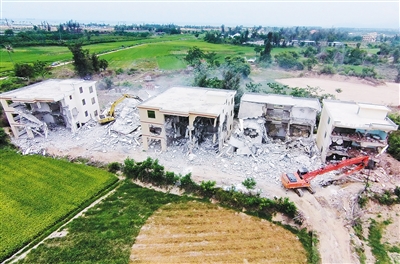 在崖州区大蛋村拆违现场,记者看到78栋高2至4层违法建筑分散在金兰坡、牛骨坡、横亚落坡和鸡根坡的农田里、芒果地里、林地上、坡地上,甚至是坟墓旁,从村口第一片违建到最远一片违建相距长达2公里远,这些违法建筑如同大规模的伤疤侵占了农用地。
