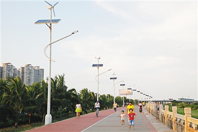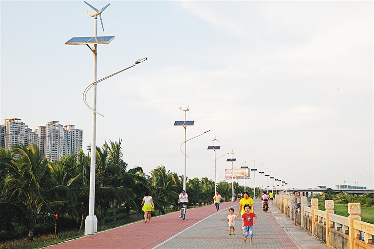 5月13日,市民在海口滨江路新型节能路灯下散步、骑行。