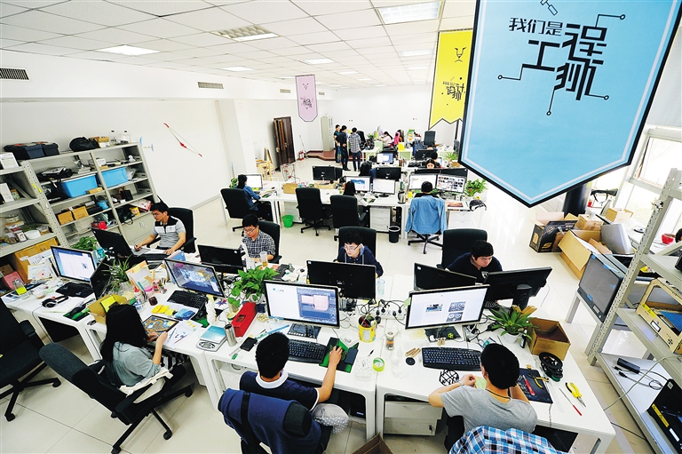在西安经济开发区,“蒜泥科技”的员工在进行研发工作(2015年4月28日摄)。“蒜泥科技”由毕业于西安电子科技大学的“创客”杨少毅和另外两名伙伴在2014年年初创立,截至2015年4月获得1500万元人民币的投资,成为西安“创客”们眼中成功的典范。 新华社记者 李一博 摄
