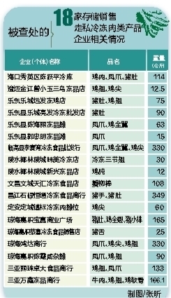 据了解,今年4月29日,省食药监系统进行了继去年8月份以来,第5次全省范围内统一行动,共检查302个冻库和销售摊点,对涉嫌储存销售走私肉类制品的18家企业(个体户)进行了查处,扣押涉嫌走私肉类产品食品2.3吨,主要有鸡爪、鸡尖、猪肚、牛肉等10多个食品品种,分别来自美国、日本、阿根廷等9个国家。