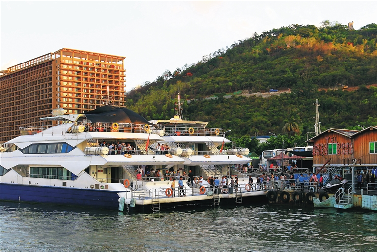 图为5月13日傍晚,三亚市南边海路扬帆游艇俱乐部码头,游客登上游船。本报记者 武威 摄
