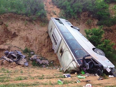 记者15日晚9时许在事故现场看到,出事车辆倒栽在深沟内,一部分车身还悬靠在山坡上,不时有石块、土块滚落。车内座椅大多数已被甩离车体,只有少数几个仍悬在车内,车辆周围散落着鞋帽、衣服、水杯等生活用品,现场血迹斑斑。发生坠崖的地点为通山公路一拐弯处,弯道较急,道路上还有车辆刹车时留下的痕迹。