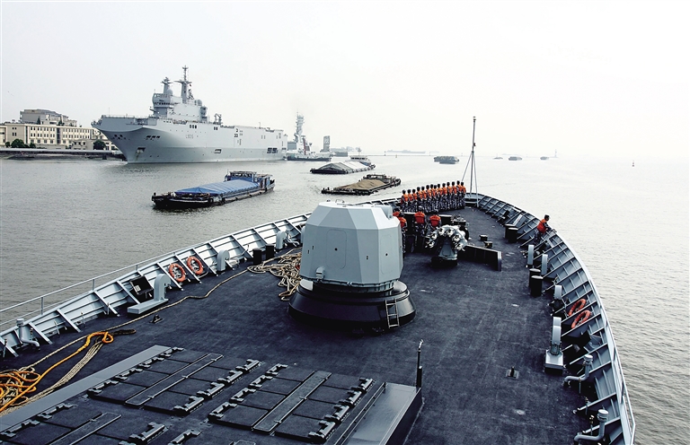 5月15日,中国海军舟山舰缓缓驶离上海吴淞军港。 当日,在结束上海为期7天的访问后,由法国海军“迪克斯莫德”号投送指挥舰和“阿克尼特”号护卫舰组成的舰艇编队,与中国海军舟山舰在东海某海域,举行以直升机互降、航行横向补给、小艇换乘等为主要内容的海上联合演练。新华社发