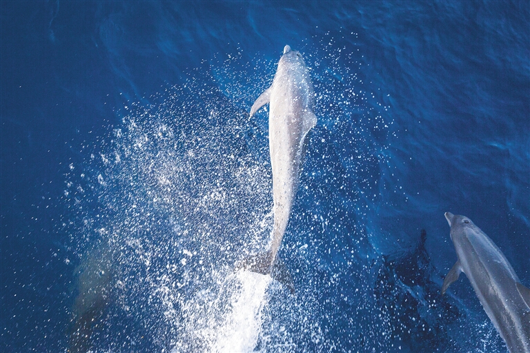 5月13日,三沙市七连屿海域,航行中的“中国考古1号”船首前突然出现了5只海豚,与考古船齐头并进。与此同时,许多鲣鸟在考古船的上空中盘旋飞翔。