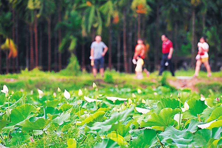 在江南步入采莲季节的同时,龙寿洋荷田也用它别具一格的热带风情融合着清秀的莲花,展现给世人一副别样美景。波光粼粼的湖面上,嫩绿的荷叶已经密密麻麻地铺满整个水面,荷花亭亭玉立,红的粉的白的连成大片,随风送香,令人心旷神怡。荷叶上滚动的晶莹露珠,令荷花更显妩媚。