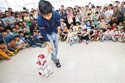 图为小朋友在中科大西区信息科学技术科普点观看智能机器人演示。 5月16日,中国科学技术大学科技活动周在合肥开幕,校内的生命科学科普点、国家同步辐射实验室、火灾科学国家重点实验室等场所对外开放。 新华社记者 张端 摄
