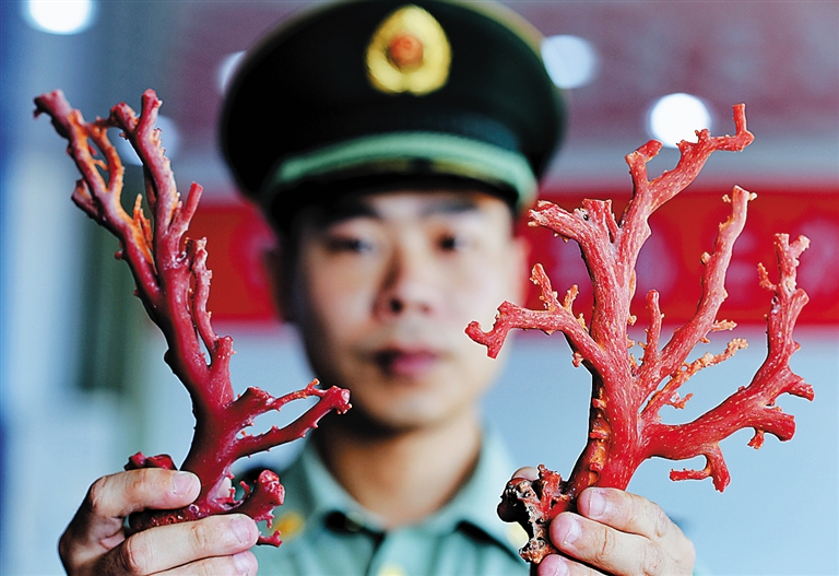 福建公安边防三沙边防派出所民警展示被查获的红珊瑚。 2014年以来,福建省海洋与渔业、公安边防、海警等16个部门在福建管辖海域联合开展打击非法采捕红珊瑚专项行动。一年来,共出动执法船艇546艘次,检查船舶46461艘次,查扣涉嫌非法采捕红珊瑚船舶100多艘,破获非法交易红珊瑚案件32起,查获红珊瑚196.1公斤,抓获犯罪嫌疑人59人。 新华社记者 张国俊 摄