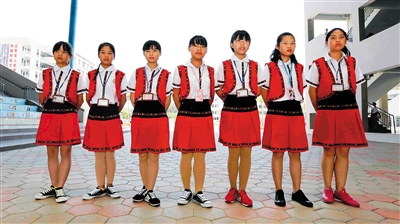 琼中民族思源实验学校初一六班的李翠萍今年13岁,作为黎族姑娘,她第一次真正穿民族服装。“我们这次发的民服白色上衣特别漂亮,传统图饰绣边也很特别。”李翠萍说,琼中有着和别人不一样的民族服校服,我们觉得很开心又很自豪。