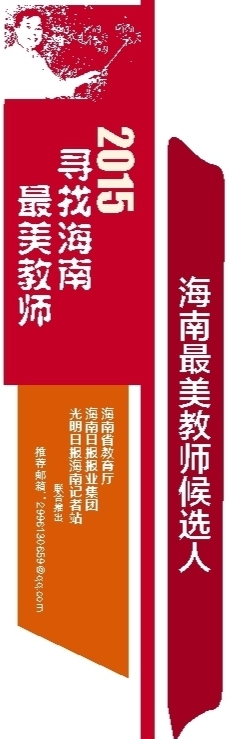 各位读者,3月24日起,教育周刊每周二都会推出海南最美教师候选人事迹报道,8月将在南海网集中投票评选,如果他们的故事曾经打动您,欢迎您给教育周刊留言。