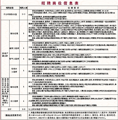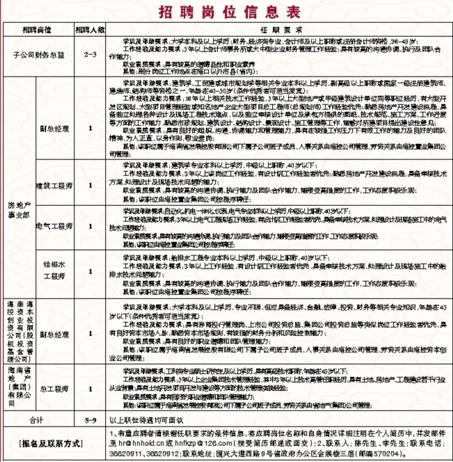 近年来,公司成立或牵头设立了海南银行、股权交易中心、贵金属交易中心、大唐发控信息产业基金、南华创业投资基金等企业,重组了省大型国企水电集团等单位,正着力实现由投融资平台向具备较强市场竞争力的国有资本投资运营转型升级。公司现诚聘以下工作岗位,诚邀广大英才与公司共谱发展新篇,公司将为聘用员工提供广阔的职业发展平台和以绩效为导向、兼具市场竞争力的薪酬待遇!