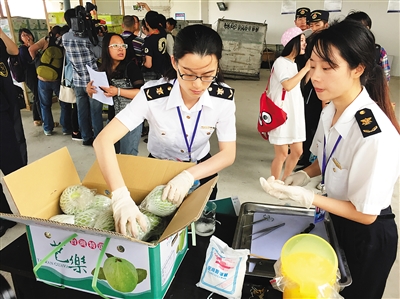 5月19日,福建平潭检验检疫人员在检查台湾水果。 当日,710箱台湾水果搭载高速客滚轮“丽娜轮”自台北抵达福建平潭澳前口岸,成为福建自贸区平潭片区挂牌后首批“登陆”的台湾水果。