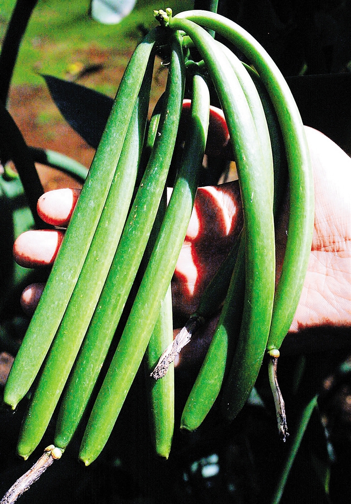 在草木葱茏、鸟语花香的兴隆热带植物园,生长着这样一种兰——地下根吸收营养,气生根吸收空气中的水分,叶片成舌状,紫蓝色的花朵格外清新。“在海南,香草兰的花期是3-5月。”热带植物园的专家介绍说,香草兰是最古老的兰科植物,原产自墨西哥,令人惊讶的是在整个兰科植物中只有香草兰能结出可食用的果实。但是令人失望的却是,香草兰花不能自花传粉,天然传粉的成功率不到1%。上世纪80年代,经过香饮所科学家们的艰难摸索,终于成功治愈了香草兰“难受孕”顽症,从此,香草兰便在海南岛上繁衍生息。
