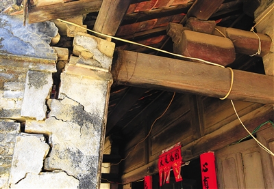 由于无法从门楼进入,记者跟随何擎国从外侧绕进去,发现义学堂的围墙早已不复存在,中厅和正堂的屋脊都因年久失修损坏严重。其中正堂屋顶的承重木梁断裂,瓦片下沉,后墙中部向外鼓出,墙壁接缝处多处开裂。中厅的屋顶也破露出一个大洞,下面用防水布简单做了遮挡,两侧墙壁部分装饰书画残存无几。不大的中厅,本是百年前儒童们启蒙的讲堂,现在成了堆放各种厨房杂物的地方,甚至还停放一辆三轮车和一辆拖拉机。