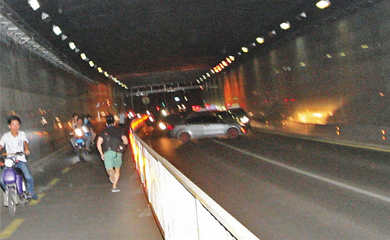 事发时,交警正在侨中隧道北侧设卡检查过往车辆,“轰……”一辆起亚轿车突然快速冲出隧道,接近交警检查卡前,突然停车,然后快速向后倒车。