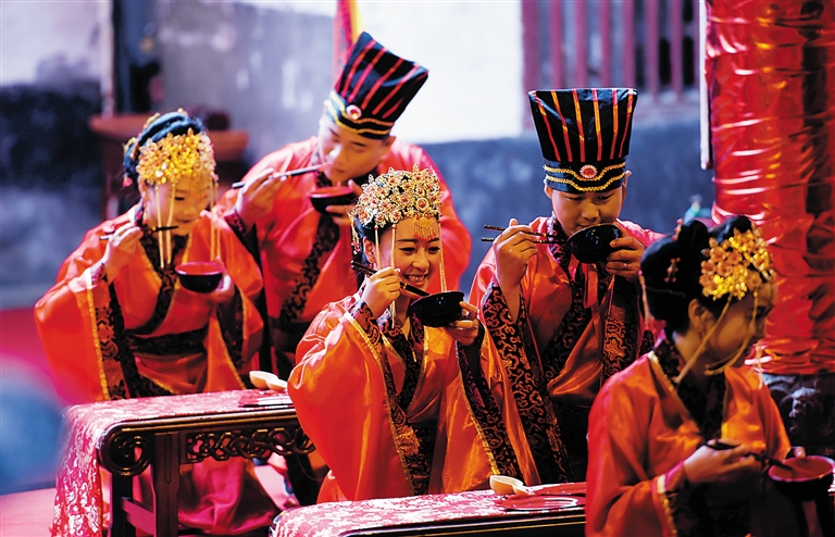 5月20日,新人们在祠堂里行同牢礼,即同席用餐,宣告今后在生活上合为一家。 当日,10对新人在始建于明代成化乙巳年间的湖南汝城县范氏祠堂里举行一场汉式集体婚礼,完成了对拜礼、沃盥礼、同牢礼、合卺礼、执手礼等传统仪式。 5月20日因为“520”谐音“我爱你”,成为现代人表达爱情的重要日子。 湖南汝城县被誉为“中国古祠堂之乡”,全县现存祠堂710多座,2013年,汝城古祠堂群被列为全国第七批重点文物保护单位。 新华社记者 李尕 摄