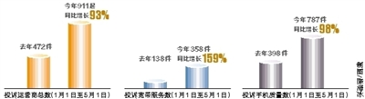 省工商局12315指挥中心数据显示,今年1月1日至5月1日,针对移动、电信、联通三大通信运营商的投诉总量,达到911件,其中,投诉电信的492件,投诉移动的279件,投诉联通的150件。而去年同期,针对三大通信运营商的投诉总量是472件,其中,投诉电信的238件,投诉移动的160件,投诉联通的74件。