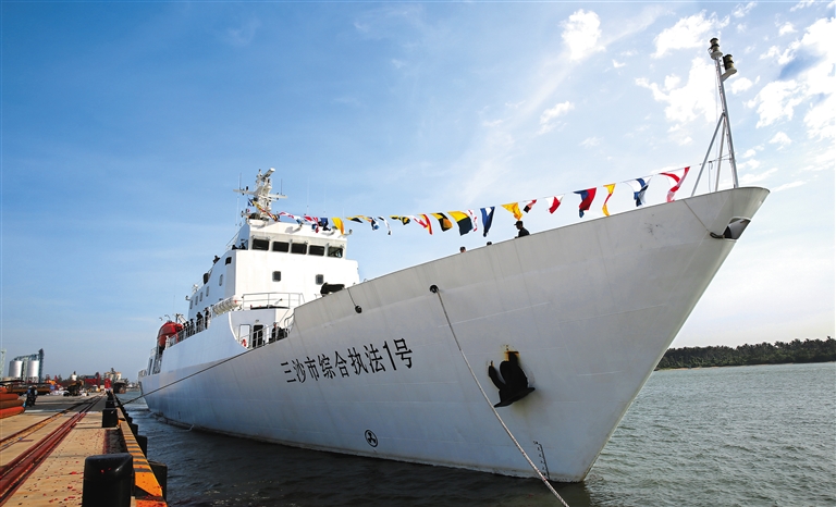据了解,三沙市综合执法1号船共有7层,船长97.5米,宽14米,吃水深度3.8米;排水量2600吨,载重量900吨,设计航速22海里/小时,续航能力6000海里,能从海南本岛续航至南沙,可在12级风下安全航行。
