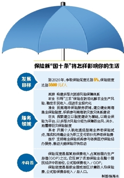 2014年8月10日,国务院印发《关于加快发展现代保险服务业的若干意见》,明确了今后较长一段时期我国保险业发展的总体要求、重点任务和政策措施。这个被业内称之为保险新“国十条”的意见,已不再是狭义上的行业概念,高度关注民生成意见的最大亮点。
