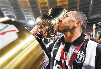 北京时间5月21日,凭借替补前锋马特里在加时赛中的进球,意甲新科冠军尤文图斯在意大利杯决赛中2:1逆转战胜拉齐奥,成就本赛季联赛和杯赛的“双冠王”。图为尤文射手特维斯亲吻意大利杯。新华社发