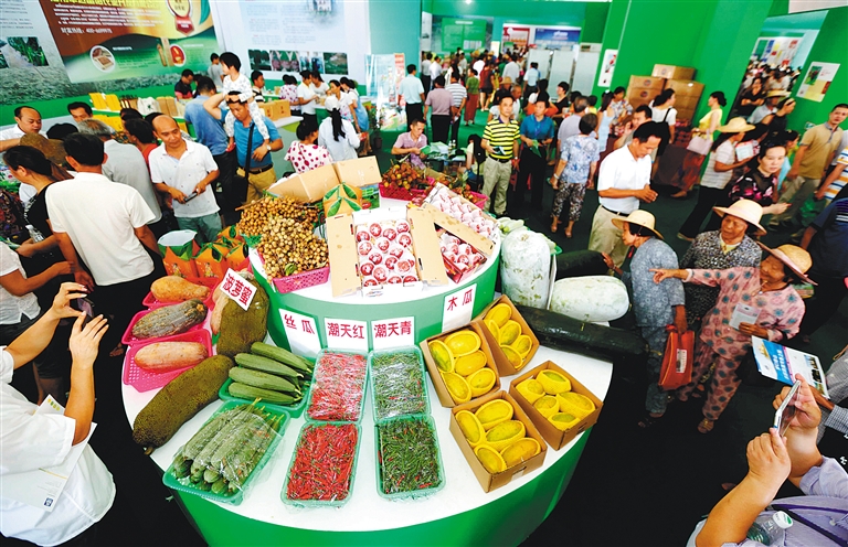 今天,农博会展馆内人头攒动。全省品牌农产品展示展销馆里,各市县都拿出了最具特色的热带水果、热带花卉、品牌农产品等参展,山竹、荔枝、莲雾、山鸡、屯昌黑猪等琳琅满目。绿盟龙庄参展人员热情地请参观者品尝水果:“水果树施有机肥,不打农药,品质有保障。”农业科技、林业、渔业等展区聚集不少观展者,有的投资商来找项目、有的农民来学技术。