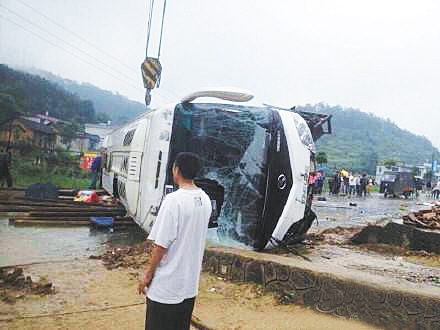 新华社长沙5月23日电 23日上午,湖南回龙镇国道线上发生一旅游大巴侧翻事故(上图),目前已致7人遇难、40余人受伤。邵阳市、新宁县正组织各方力量全力救治伤员和安排事故处置。据初步调查,事故车上载有52名乘客,为长沙某旅游公司组织的人员。目前初步判断车祸系雨天路滑,司机不熟悉路况,急刹车导致车辆发生侧翻。