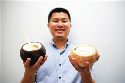 有一天,他在路边买了个椰子喝水,突然想到椰子就是海南的特产,能否做和椰子有关的产品呢?做没人做过的椰冻奶酪如何?没想到就是这个椰冻奶酪在2014年的海南省创业大赛上获得第二名,也让他赚得盘满钵满。