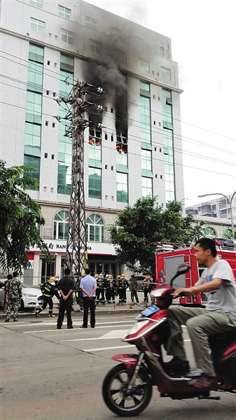 当天下午5时3分,海口消防支队119指挥中心接到市民报警,南沙路的地质大厦5楼冒出浓烟,着火了!接到报警后,海口消防支队第一时间调派金盘、金融、特勤等3个中队赶赴现场扑救,国兴、琼山中队赶赴增援。
