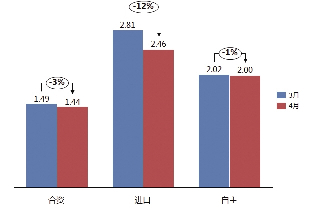 4月份,合资、进口、自主品牌库存系数均有不同程度的下降。合资品牌库存系数由上月1.49降至1.44,环比下降3%,处于警戒线以下,库存压力略有缓解;进口品牌库存系数由上月的2.81降至2.46,环比下降12%,虽然下降幅度较大,但是库存水平仍处于高位;自主品牌库存系数由上月的2.02降至2.00,环比下降1%,自主品牌SUV热销,但轿车市场萎缩,导致经销商滞销车型增加,库存压力未能得到改善。