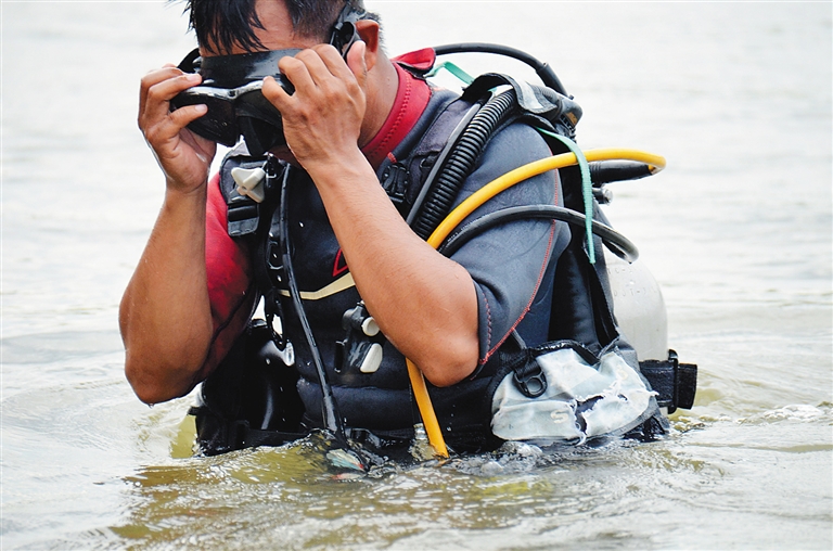 5月26日,在老挝巴俄县,一名潜水员准备入水搜救。当日,距离老挝首都万象市中心约60公里的巴俄县南俄河上发生一起渡船倾覆事故,导致10名小学生失踪,翻船原因为严重超载。新华社发