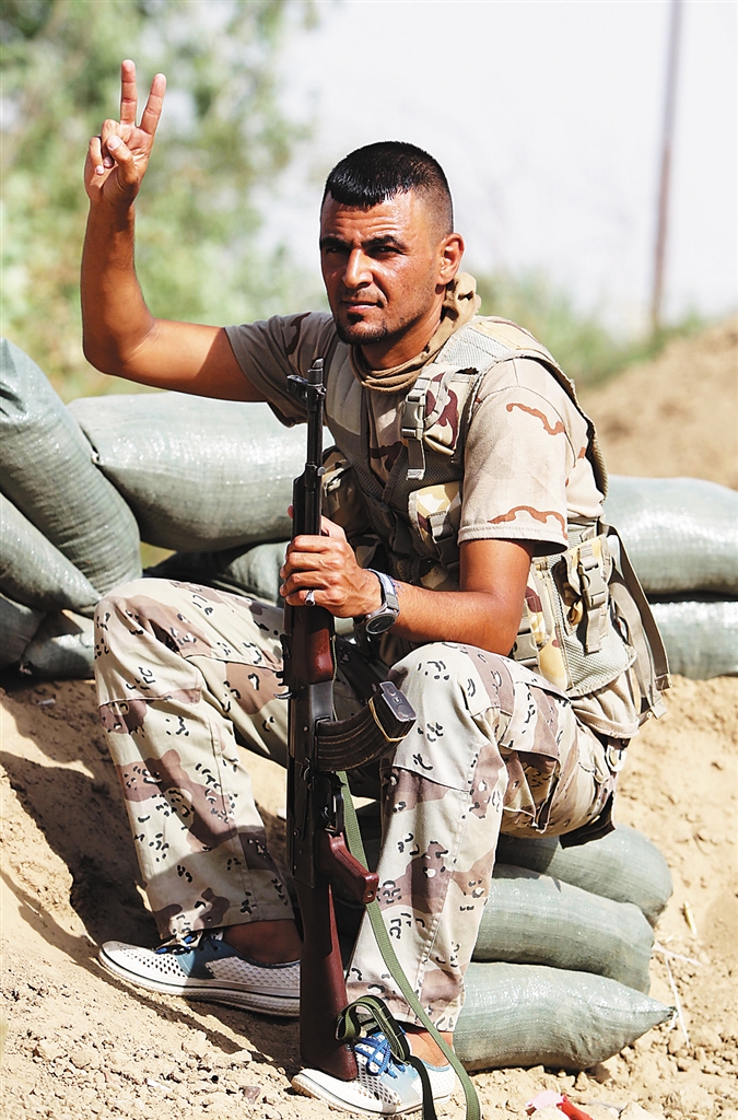 5月25日,在伊拉克拜伊吉炼油厂附近,一名伊拉克逊尼派民兵做出胜利的手势。 伊拉克民兵组织“人民动员组织”发言人艾哈迈德·阿萨迪26日上午通过伊国家电视台宣布,伊安全部队、什叶派和逊尼派民兵当天同时在西部安巴尔省和北部萨拉赫丁省发起大规模军事行动,力图收复被“伊斯兰国”武装分子占领的安巴尔省首府拉马迪。 新华社/法新