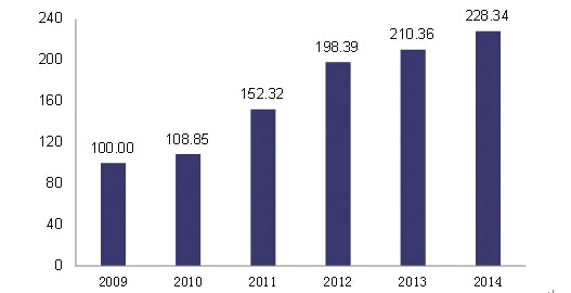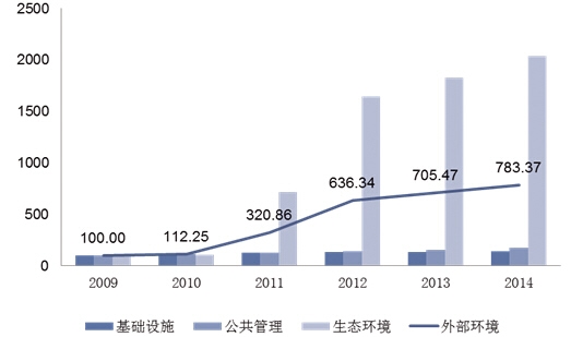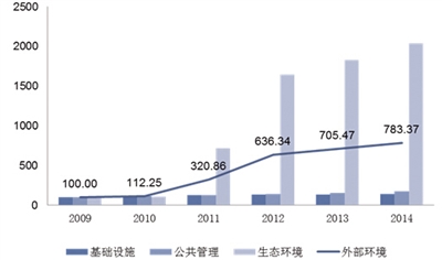 2014年,海南国际旅游岛综合环境发展指数为783.37,比2013年增长77.9,2009-2014年指数年平均增长率为50.94%。其中,海南生态环境指数相对基期增幅最大,于2014年到达2037.68点。这表明,海南国际旅游岛的综合环境建设营造力度加大,效果比较明显。
