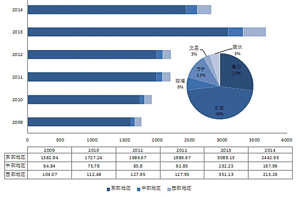 2013年,海南省整体饭店接待人数达到了峰值,几乎达到2009年的一倍左右,之后触顶回落,2014年旅游饭店接待人数下降。饼状图反映了2014年东部地区部分市县旅游饭店接待游客占比,其中三亚以46%的绝对优势遥遥领先于其他市县。