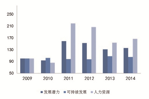 海南国际旅游岛旅游发展潜力指数重点从旅游产业可持续发展水平和人力资源两个方面影响因素进行了分析。