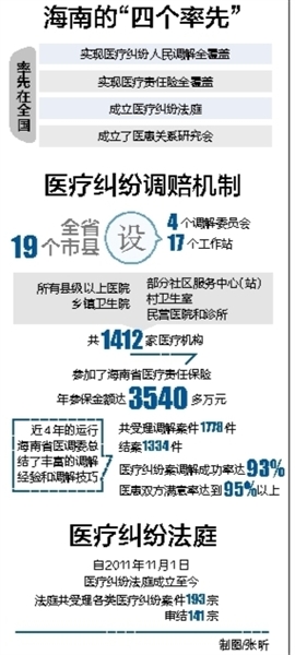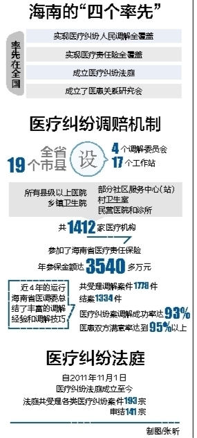 “打通医患纠纷解决途径,让患者维权不再无门,让医院将精力用在治病救人的专业上。”海南省卫计委主任韩英伟说,海南用4年时间逐步趟出了一条具有海南特色的医患矛盾解决道路:率先在全国实现医疗纠纷人民调解全覆盖,率先在全国实现医疗责任险全覆盖,率先在全国成立医疗纠纷法庭,率先在全国成立了医患关系研究会。