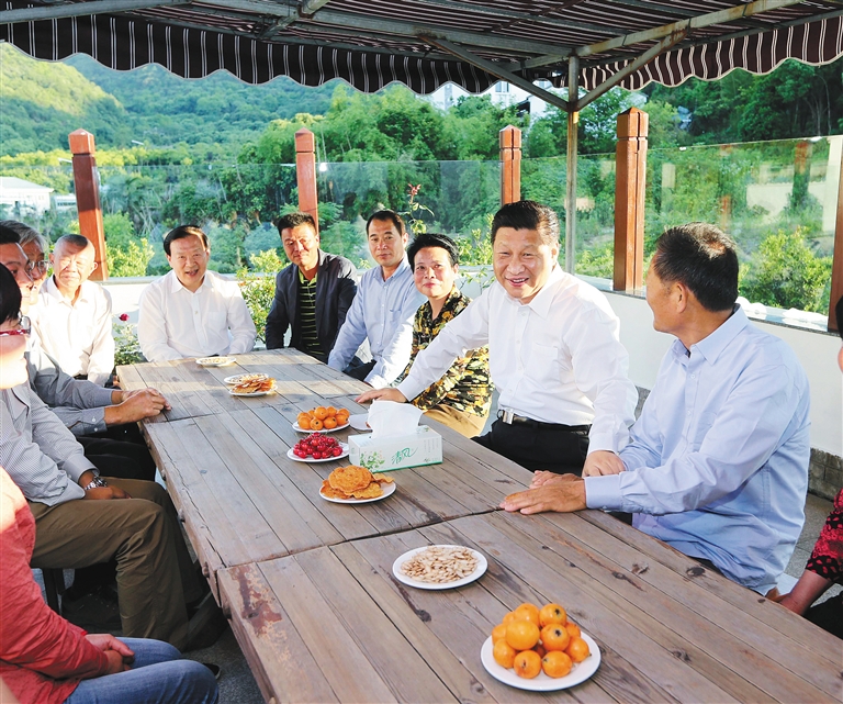 在以开办农家乐为主业的村民袁其忠家里,习近平察看院落、客厅、餐厅,同一家人算客流账、收入账,随后同一家人和村民代表围坐一起促膝交谈。大家争着向总书记介绍,他们利用自然优势发展乡村旅游等特色产业,收入普遍比过去明显增加、日子越过越好,习近平表示,这里是一个天然大氧吧,是“美丽经济”,印证了绿水青山就是金山银山的道理。习近平指出,提高城乡发展一体化水平,要把解放和发展农村社会生产力、改善和提高广大农民群众生活水平作为根本的政策取向,加快形成以工促农、以城带乡、工农互惠、城乡一体的工农城乡关系。离开社区时,闻讯赶来的群众齐声高呼:“总书记,您好!”“总书记,感谢您!”习近平向他们回致谢意,握手告别。