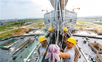5月27日,在海口市长滨西五街海南省肿瘤医院工程项目现场,施工人员正在安装主楼的幕墙。据了解,海南省肿瘤医院主楼主体工程已经结束,开始进入室内装修阶段,预计年底可开业。
